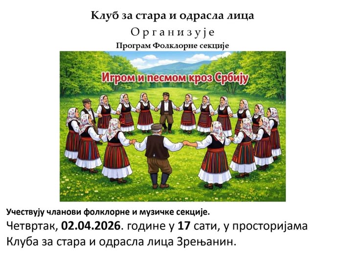 У четвртак 02.04.2026. године на радост љубитеља фолклора, одржан је у нашем Клубу програм под називом “Игром и песмом кроз Србију.”. У пријатном амбијенту пуне сале нашег Клуба, украшене сликарским радовима наших вредних сликарки, у програму су се представили углавном чланови фолклорне секције, уз неизбежну сарадњу истакнутих чланова музичке секције. Наши фолклораши предвођени агилним и успешним кореографом Срђаном Милићем вредно и предано вежбају сваке недеље и ово је била прилика да покажу свима шта су научили.,. Одлична прилика за окупљање искрених љубитеља фолклора и музике.